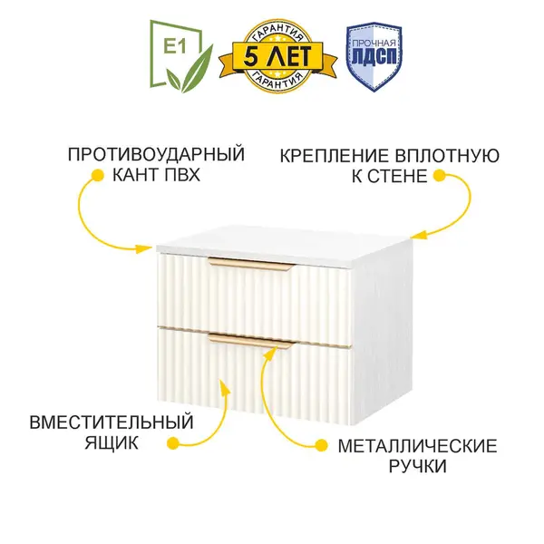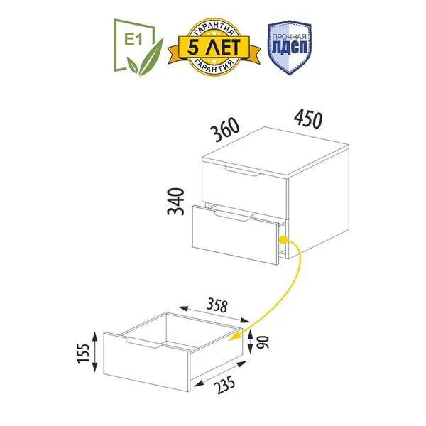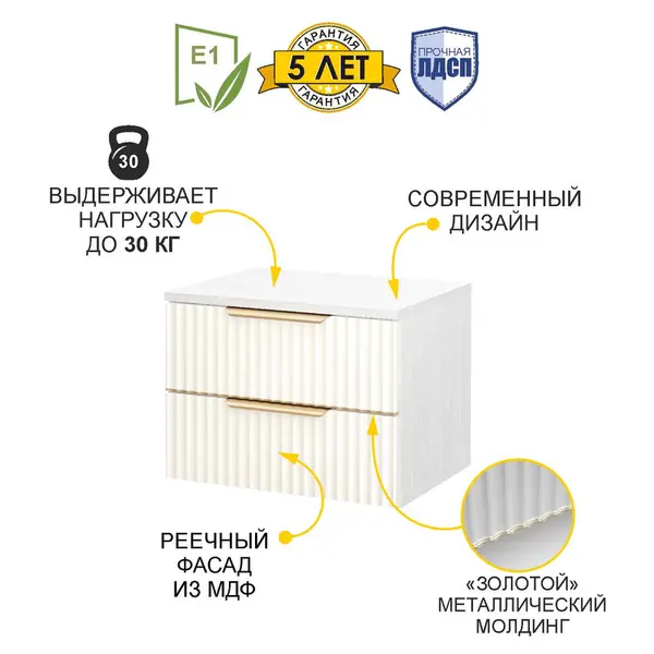 • Фасады ящиков изготовлены из материала МДФ класса Е1. Материалы безопасны для здоровья и рекомендованы к производству мебели для спален, гостиных и детских комнат.