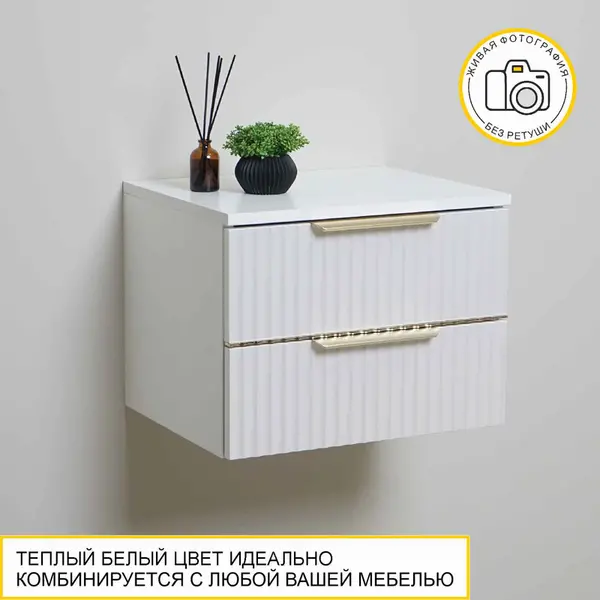 Тумба выполнена в теплом белом цвете. Она выглядит гармонично и идеально комбинируется с любой Вашей мебелью и аксессуарами. Такое сочетание является актуальной классикой.