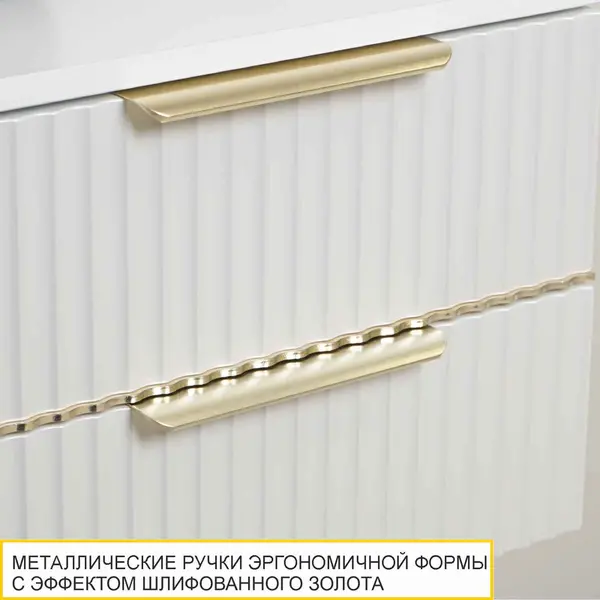• Металлические ручки эргономичной формы с эффектом шлифованного золота — это стильный и функциональный аксессуар для тумбы.