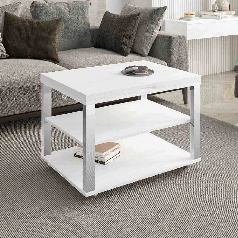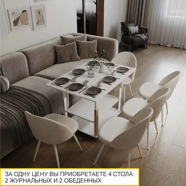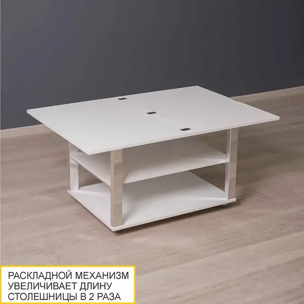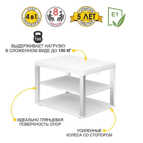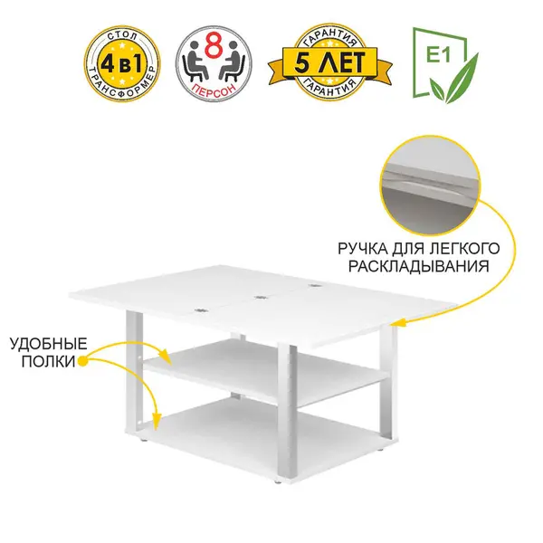• Журнальный стол-трансформер благодаря раскладному механизму легко превращается в обеденный или письменный стол и имеет четыре варианта трансформации. За одну цену Вы приобретаете 4 стола: 2 журнальных – один компактный, второй – с увеличенной столешницей, а также 2 обеденных стола на 4 и 8 персон.