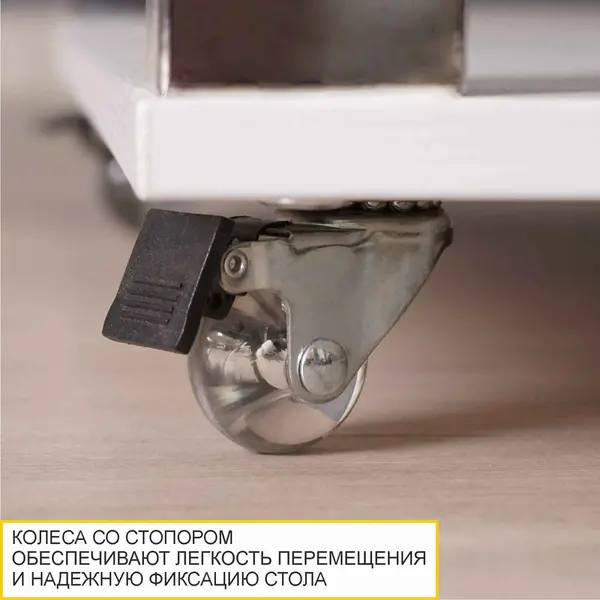 • Усиленные поворотные колеса со стопором позволяют зафиксировать стол в нужном положении для удобства его трансформации.