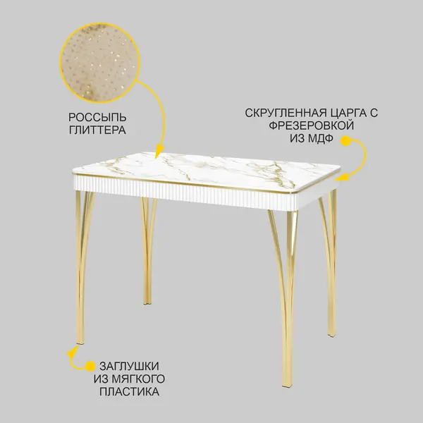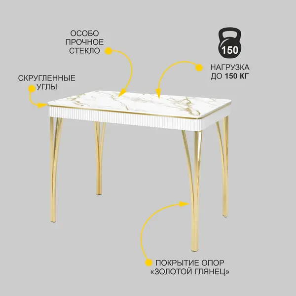 Кухонный стол со стеклом выполнен в благородном белом и золотом цвете. Такое сочетание добавит нотку роскоши и особой атмосферы Вашей комнате. Декор «мрамор» придает изысканный и элегантный внешний вид изделию. Линейка товаров «Venerdi» создана с учетом многолетнего опыта разработки и производства мебели. Эта мебель произведена на одной из крупнейших фабрик России. Вы всегда можете связаться с нами по вопросам качества товара.