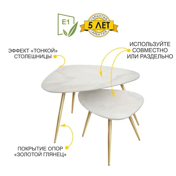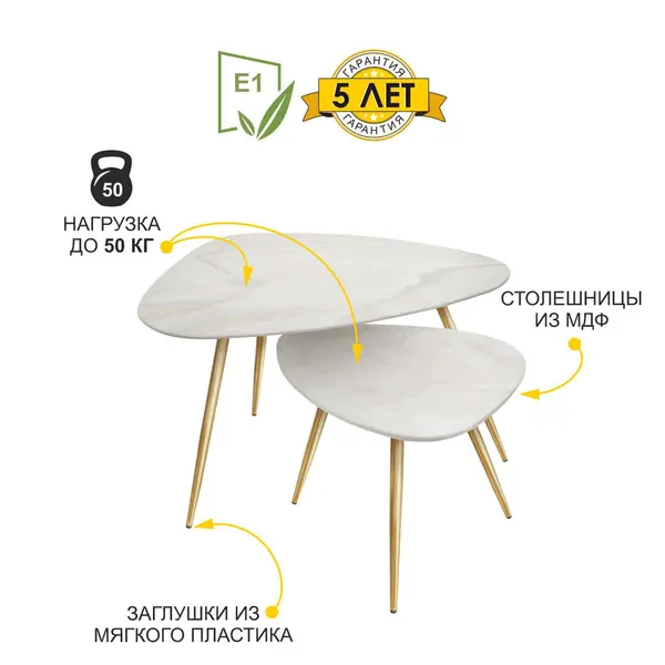 • Комплект столиков изготовлен из МДФ - данный материал безопасен для здоровья и рекомендован к производству мебели для кухонь, спален и детских комнат.
