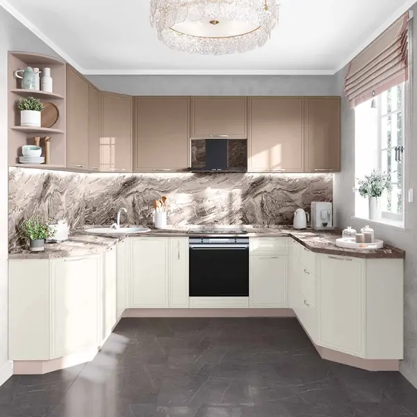 • Гармоничное сочетание теплого цвета «Мокко» и светлого «Крем-брюле» дарит кухне спокойствие и уют.