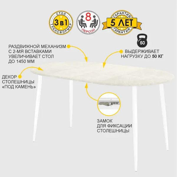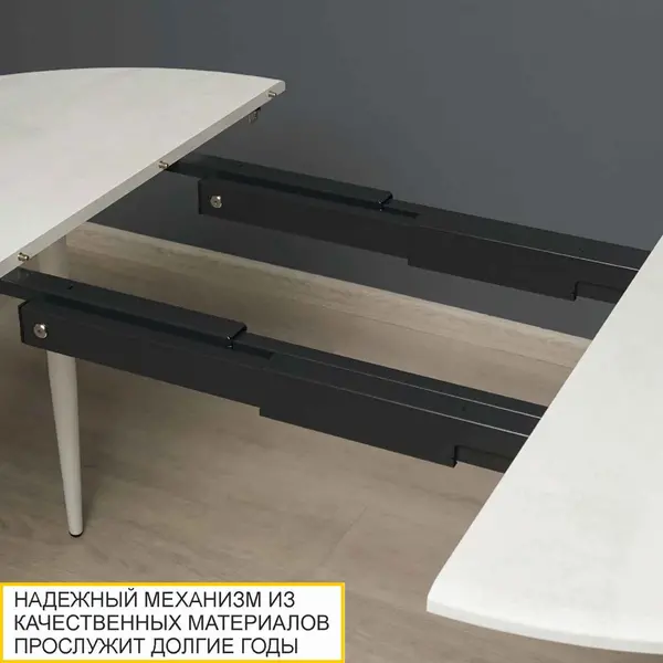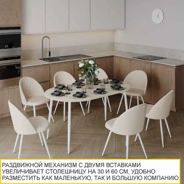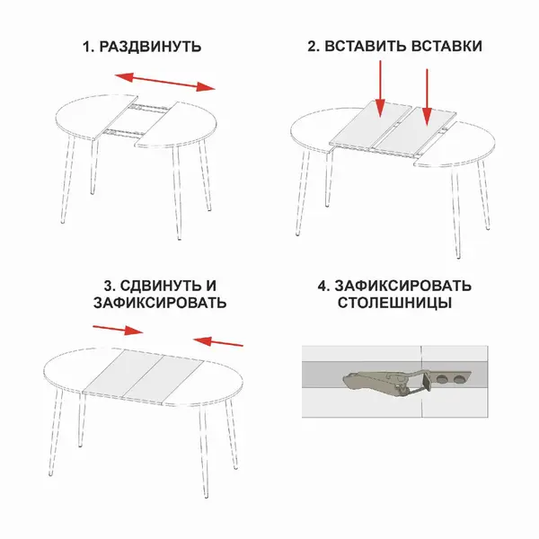 • Раздвижной механизм с 2-мя вставками увеличивает размер столешницы на 30 см и на 60 см. Удобно разместить как маленькую, так и большую компанию в любой праздник.