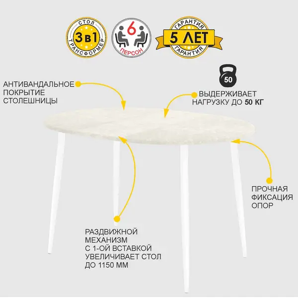 • Обеденный стол устойчив к равномерно распределенной нагрузке – до 75 кг в сложенном виде, а в полностью разложенном – до 50 кг.