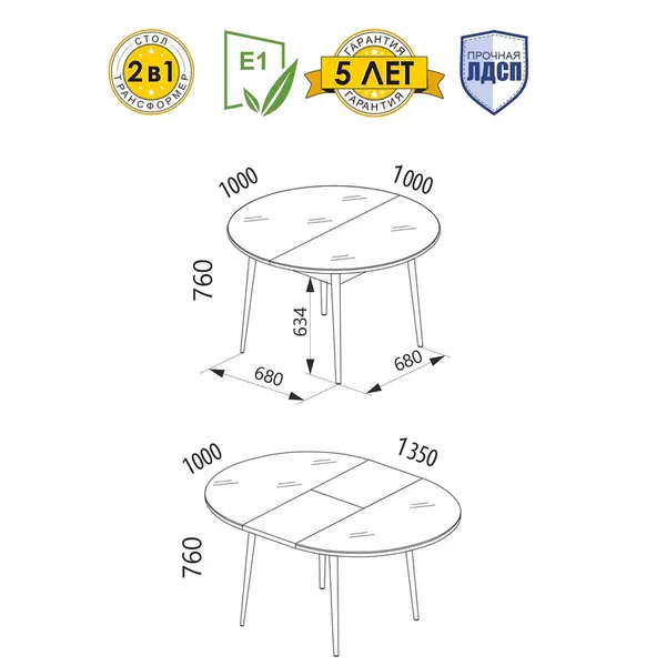 • За одну цену Вы приобретаете 2 стола! В сложенном виде – это компактный круглый стол диаметром 100 см. Надежный механизм «синхронное раздвижение и вставка-бабочка» позволяет трансформировать столик во вместительный овальный стол с размером столешницы 135 см.