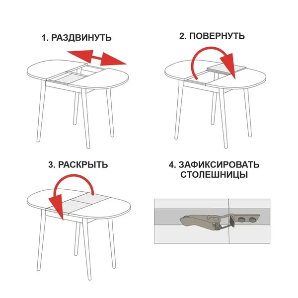 • Раскладной механизм увеличивает длину столешницы, что позволяет разместить за столом большое количество гостей.