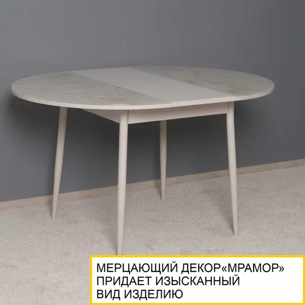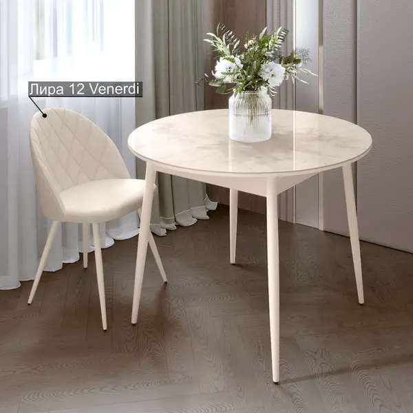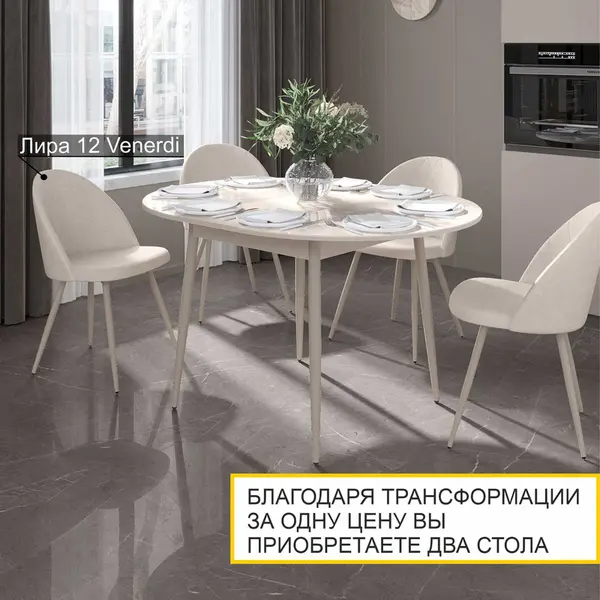 Обеденный стол выполнен в трендовом сочетании бежевых оттенков, которые создают стильный и элегантный образ. А декор столешницы совмещает в себе элегантность линий и изысканное мерцание мрамора.