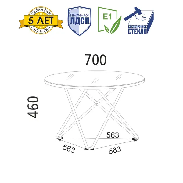 • Журнальный стол круглый выполнен из ЛДСП повышенной прочности, материал устойчив к механическому истиранию.