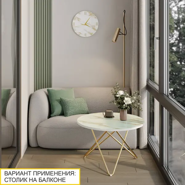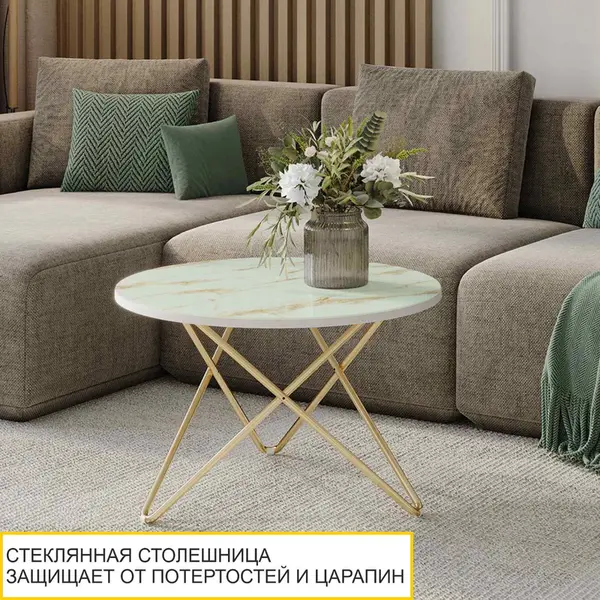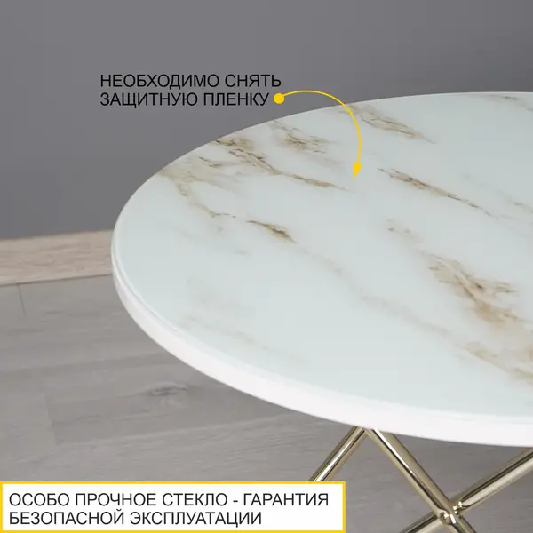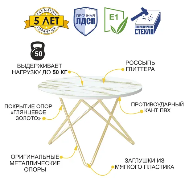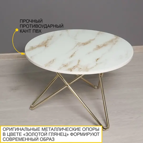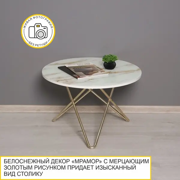 Столик выполнен в благородном белом цвете с «золотыми» опорами. Такое сочетание добавит нотку роскоши и особой атмосферы Вашей комнате. Декор «мрамор» с мерцающим золотым рисунком придает изысканный и элегантный внешний вид изделию.
