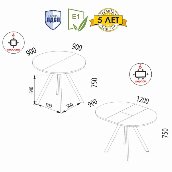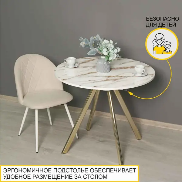 • Современная круглая форма столешницы исключает риск получения травм, безопасна для маленьких членов семьи. Вам не придется защищать углы специальными накладками для острых углов.