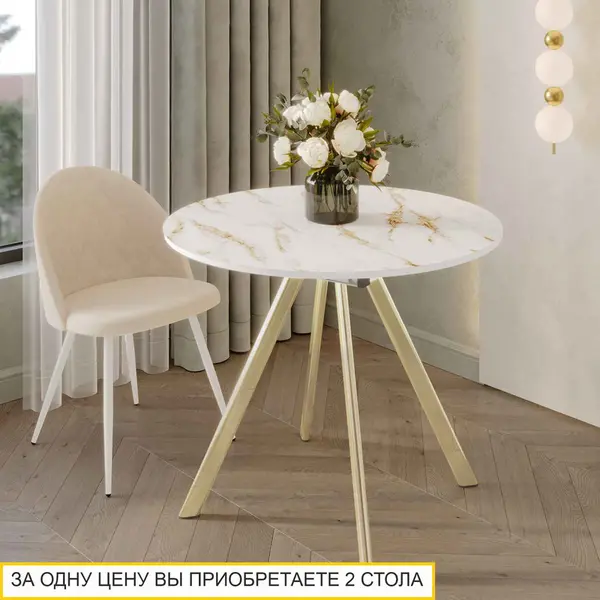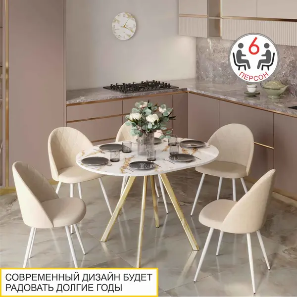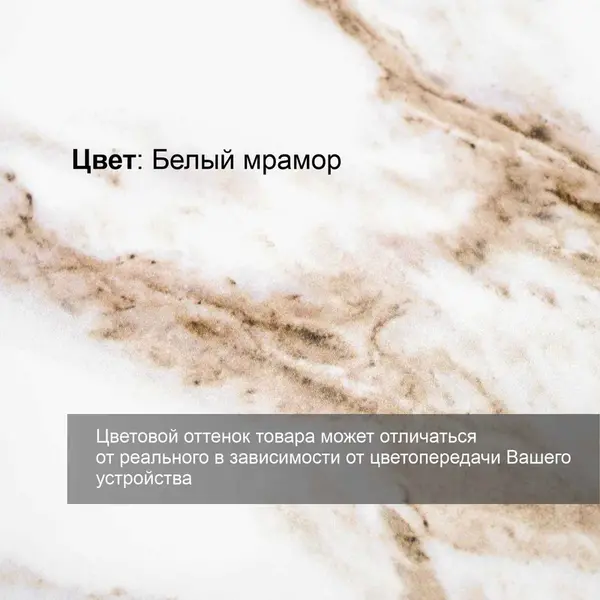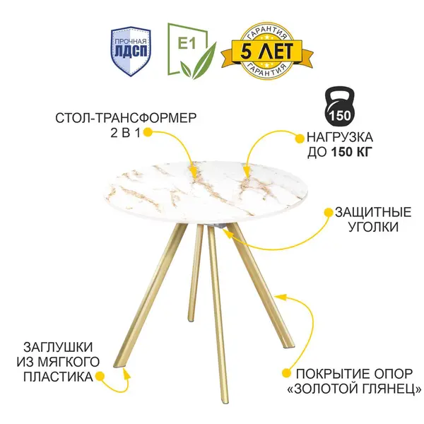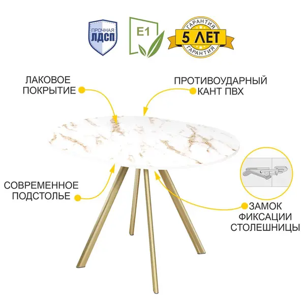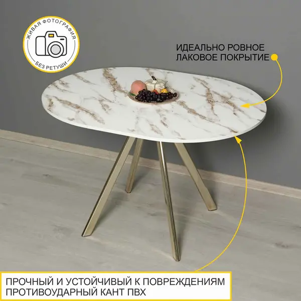 Стол выполнен в стильном цвете «Белый мрамор». Этот оттенок сочетает в себе классические белые тона и изысканность мрамора. А в комбинации с золотыми опорами создает неповторимый образ.