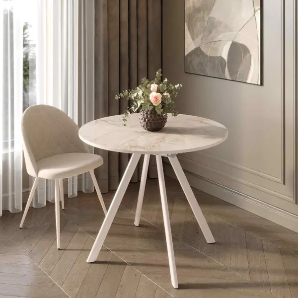 • За одну цену вы приобретаете 2 стола! В сложенном виде – это компактный круглый стол диаметром 90 см. Надежный механизм синхронного раздвижения и вставка-бабочка позволяет трансформировать столик во вместительный овальный стол с размером столешницы 120 см.