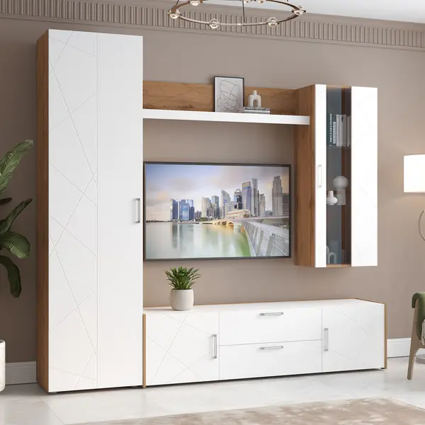 • Сочетание белоснежной поверхности фасадов «Синга крем» с благородной древесной текстурой «Дуб Вотан» подчеркивает изысканный дизайн коллекции.
