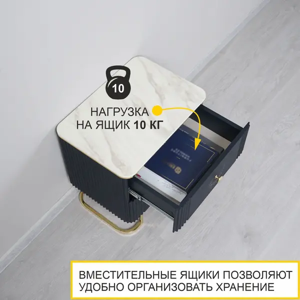 Вместительные выдвижные ящики без внутренних перегородок позволяют комфортно разместить нужные вещи. Шариковые направляющие обеспечивают плавный бесшумный ход и длительный срок эксплуатации изделия, а полное выдвижение помогает быстро и легко найти необходимые вещи. Вы сможете хранить книги, очки, зарядные устройства и другие мелочи, которые всегда должны быть под рукой. Ящик выдерживает нагрузку до 10 кг.
