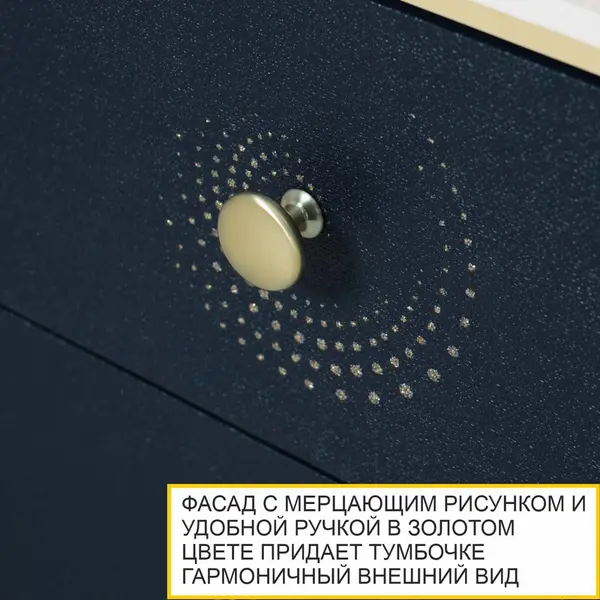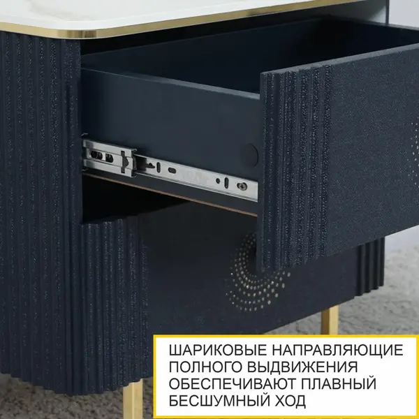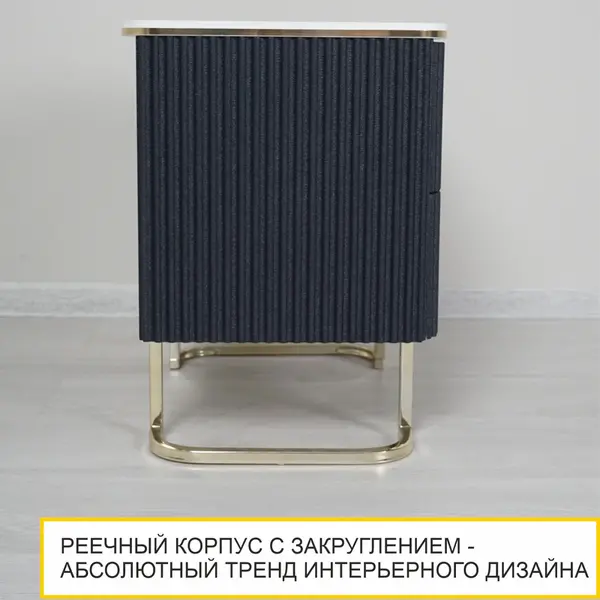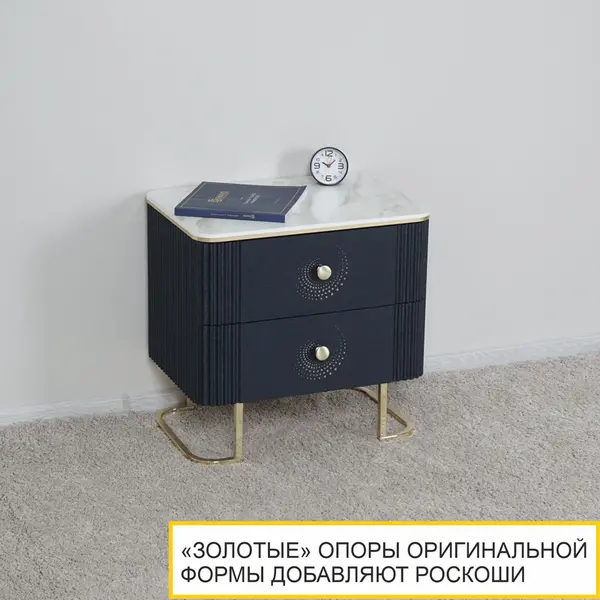 Тумба Аккорд 15 - это не просто функциональный предмет мебели, но и стильный элемент, который добавит изысканности вашему интерьеру. Эта тумбочка станет идеальным дополнением вашей спальни, сочетая в себе практичность и элегантный дизайн. Прикроватная тумбочка в глубоком синем цвете в сочетании со светлой столешницей и золотыми опорами станет изюминкой интерьера. Дизайн столешницы под мрамор создает элегантный образ, имитируя текстуру и внешний вид натурального камня.