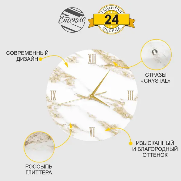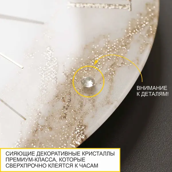 • Сияющие декоративные стразы "Crystal" премиум-класса придают настенным часам изысканный вид. Стразы сверхпрочно клеятся к стеклу.
