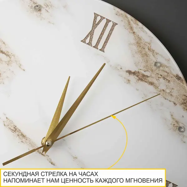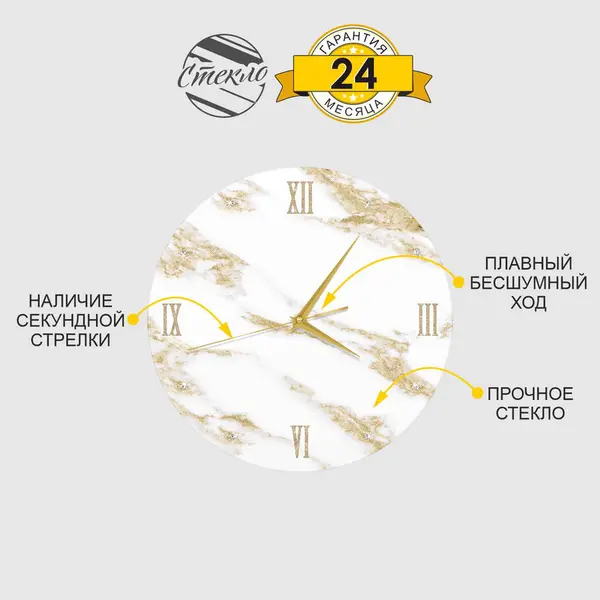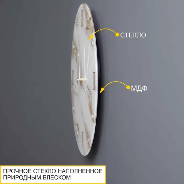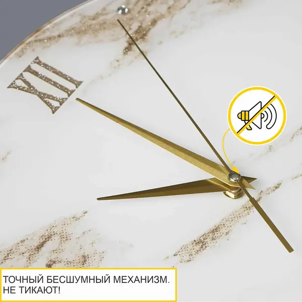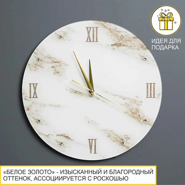 Часы настенные бесшумные выполнены в цвете "Белое золото" — это изысканный и благородный оттенок с мраморными вкраплениями, сочетающий в себе белизну мрамора и яркость золота. Этот цвет ассоциируется с роскошью, изысканностью и элегантностью, добавляя шик и стиль любому интерьеру. Часы могут не только показывать время, они станут красивым акцентом, элементом декора для дома или офиса. Они также могут использоваться в качестве оригинального подарка для коллег и близких.