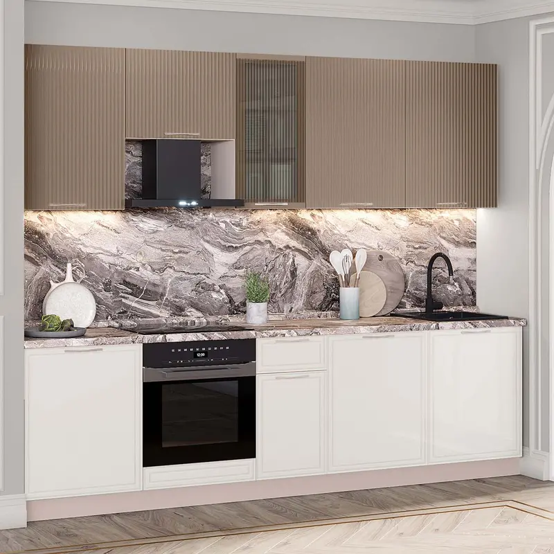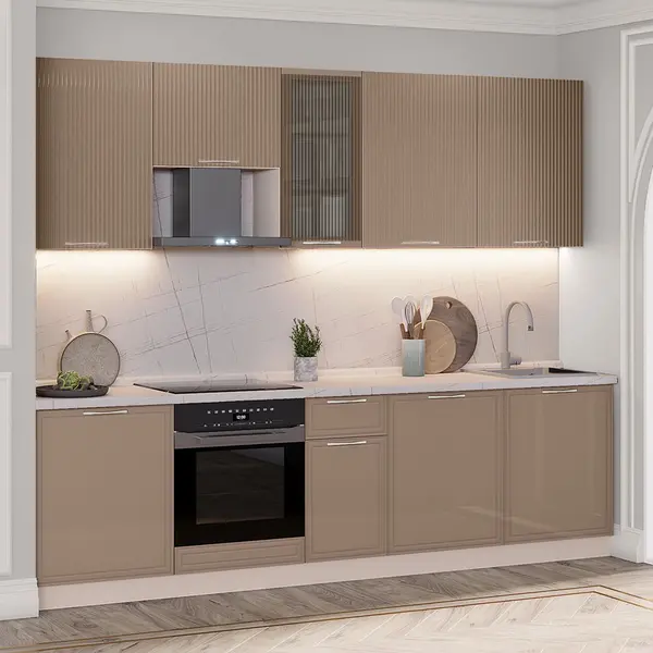 • Глянцевые фасады с оригинальной рамкой и актуальной фрезеровкой «рейки» поддерживают современный стиль, добавляя интерьеру ритмичности и утонченности.