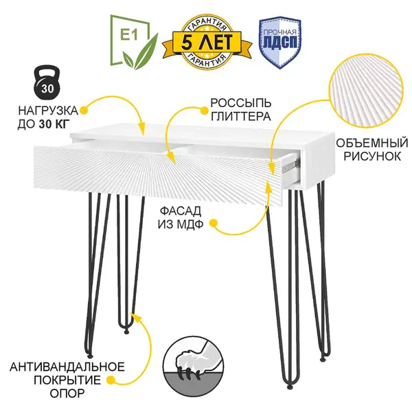 • Столик изготовлен из ЛДСП и МДФ класса эмиссии Е1 - данные материалы безопасны для здоровья и рекомендованы к производству мебели для кухни, спальни и детских комнат.