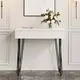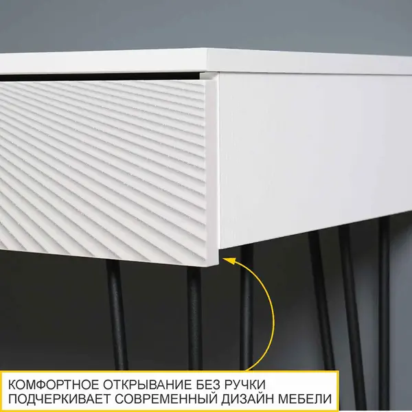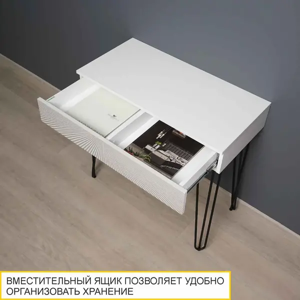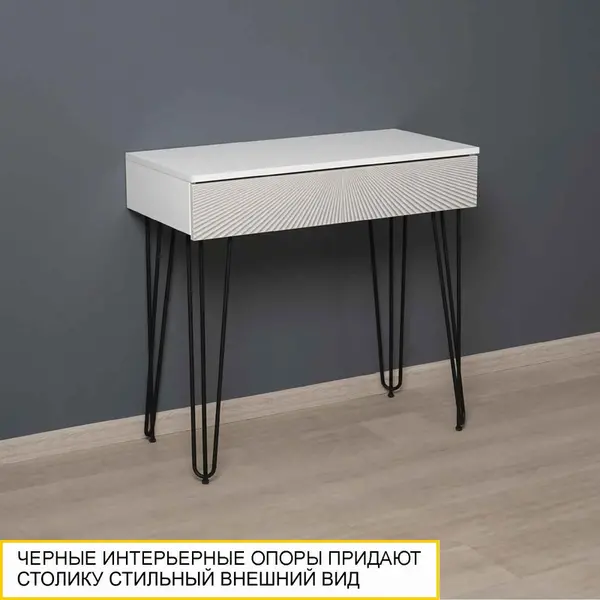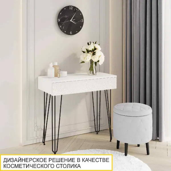 Туалетный столик выполнен в теплом белом цвете «крем-брюле», который идеально сочетается с черными металлическими опорами. Такое сочетание является базовым для гармоничного и стильного интерьера.