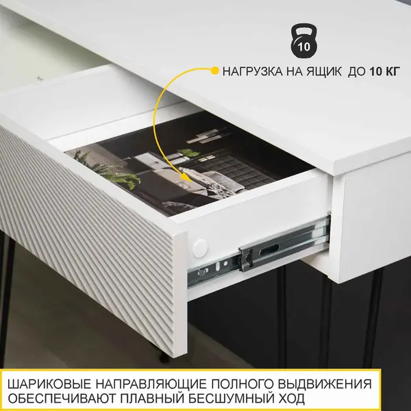 • Шариковые направляющие полного выдвижения обеспечивают плавный бесшумный ход и длительный срок эксплуатации туалетного столика, а полное выдвижение позволяет быстро и легко найти необходимые вещи и предметы интерьера.