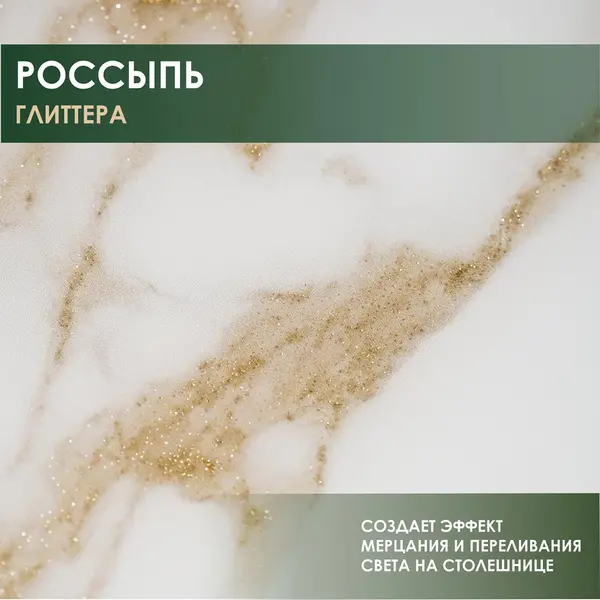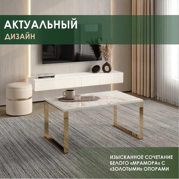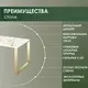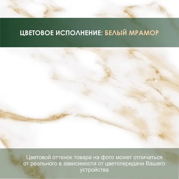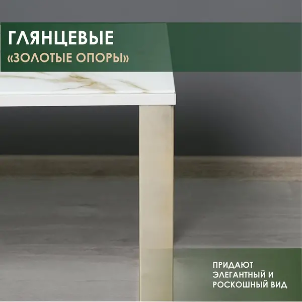 Столешница выполнена в элегантном и стильном цвете «Белый мрамор». Этот оттенок сочетает в себе классические белые тона и изысканность мрамора. А в сочетании с золотыми опорами создается неповторимый образ стола.