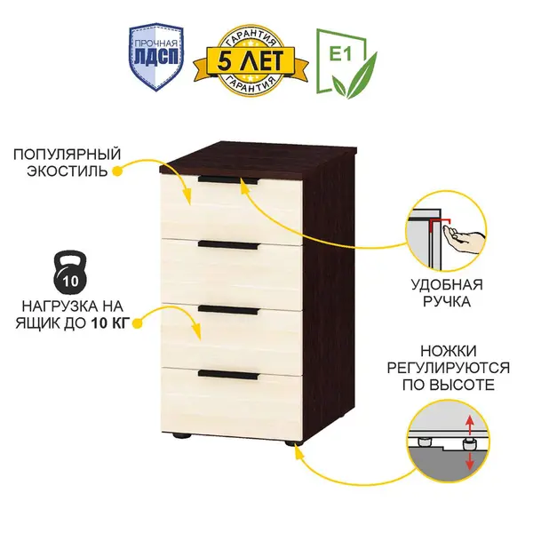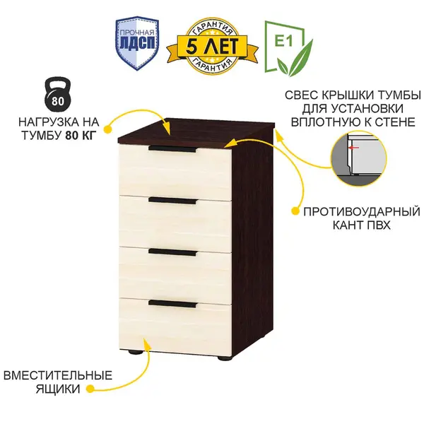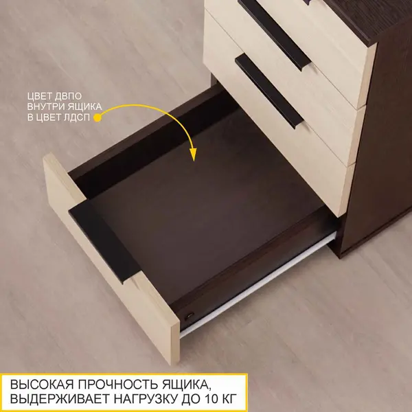 • Тумба оснащена четырьмя вместительными ящиками, что позволяет удобно организовать хранение важных предметов.