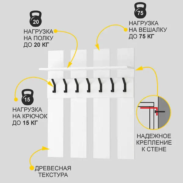 • Вешалка настенная выдерживает максимально допустимую нагрузку до 75 кг.