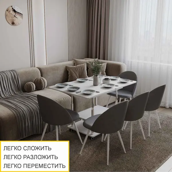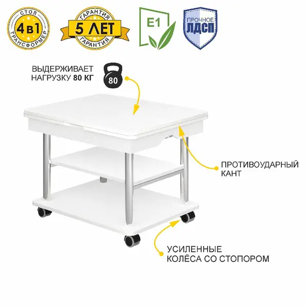 • Раскладной журнальный стол-трансформер легко превращается в обеденный или письменный стол и имеет четыре варианта трансформации. За одну цену Вы приобретаете 4 стола: 2 журнальных - один компактный, второй - с увеличенной столешницей, а также 2 обеденных стола – на 4 и 8 персон.