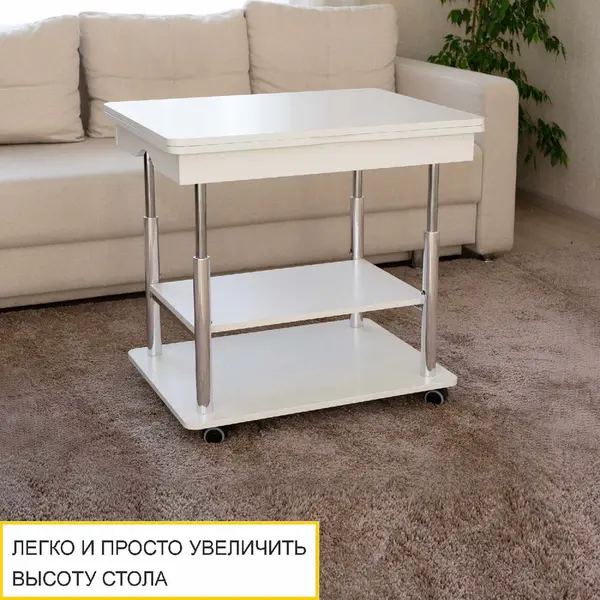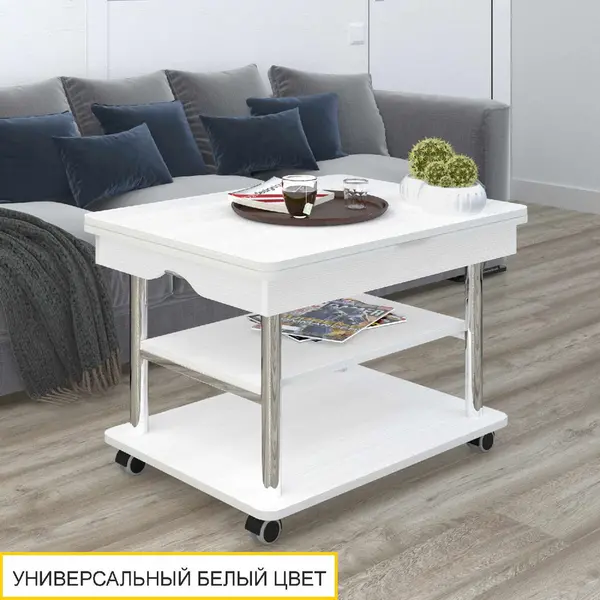 Журнальный стол-трансформер выполнен в актуальном и универсальном белом цвете, его можно сочетать с любыми другими цветами и фактурами. В то же время он добавляет интерьеру свежести и визуально расширяет пространство. Имитация легкой древесной текстуры создает ощущение натуральности интерьера.