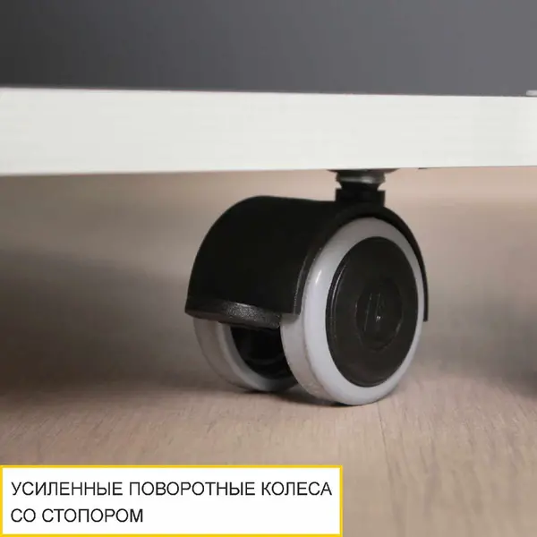 • Усиленные поворотные колеса со стопором позволяют зафиксировать стол в нужном положении для удобства его трансформации.