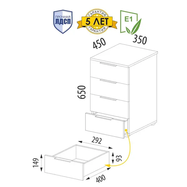 • Тумбочка к компьютерному столу изготовлена из материала ЛДСП класса эмиссии Е1, который безопасен для здоровья и рекомендован к производству мебели для кухонь, спален, прихожих и детских комнат.