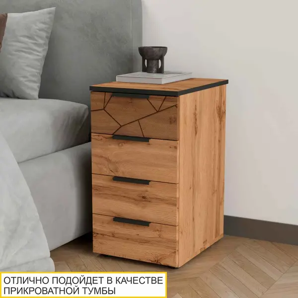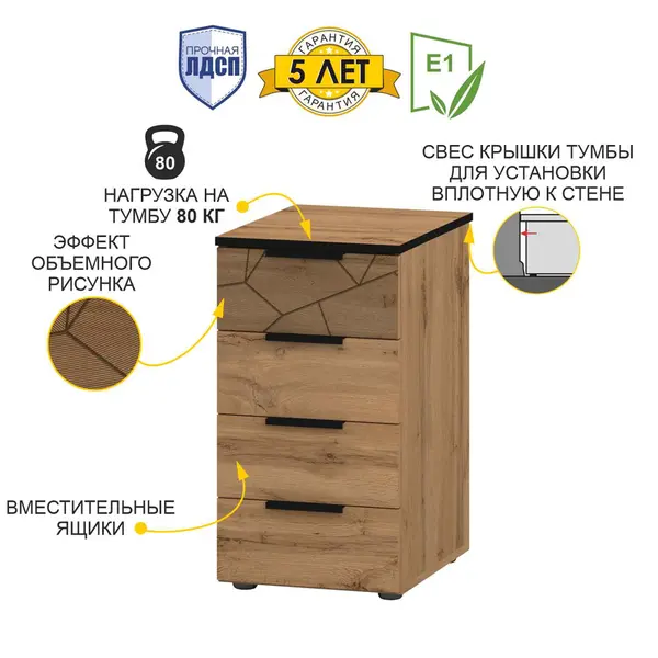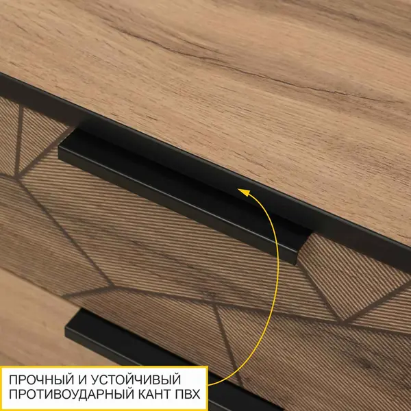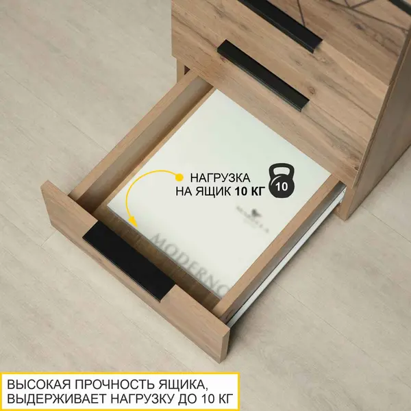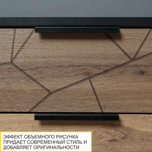 • Эффект объемного рисунка на фасаде выдвижного ящика придает современный стиль тумбочке и добавляет ей оригинальности.