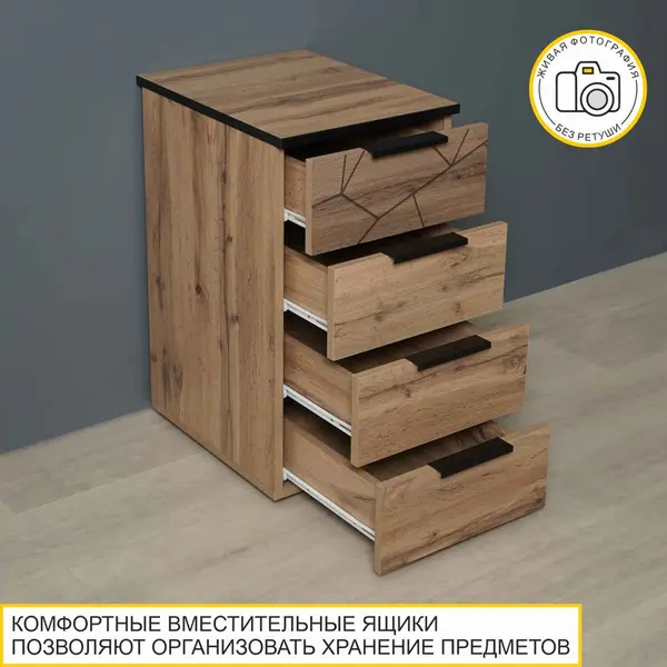• Тумба напольная оснащена четырьмя вместительными ящиками, что позволяет удобно организовать хранение важных предметов.