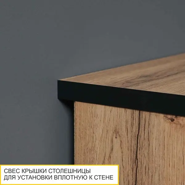• Свес крышки тумбы позволяет установить ее вплотную к стене даже с плинтусом. Зазор между стеной и тумбой рассчитан таким образом, чтобы было удобно располагать различные провода от техники, а также напольный плинтус.