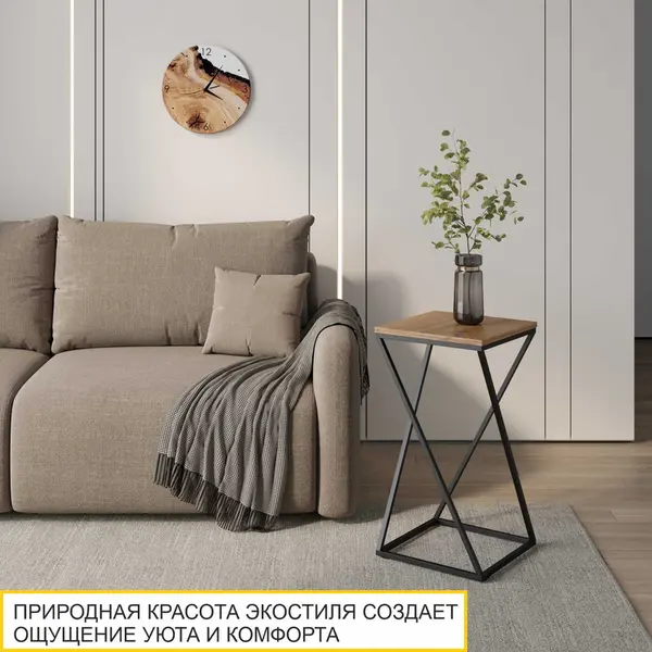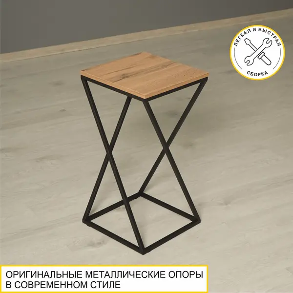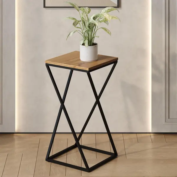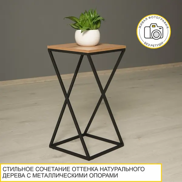 Подставка под цветы выполнена в теплых оттенках натурального дерева, которые создают уютную атмосферу и ощущение близости к природе, а имитация древесной текстуры добавляет модную нотку экостиля. Контрастные металлические опоры черного цвета подчеркивают стильный дизайн подставки под цветы.