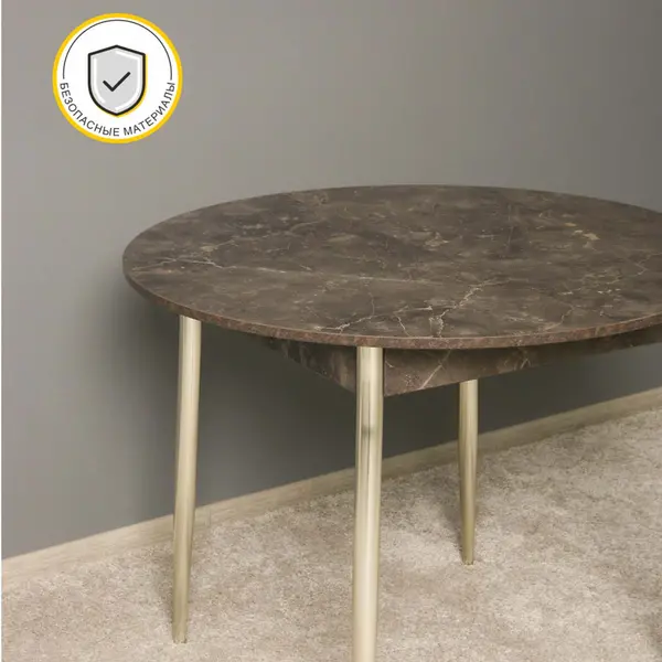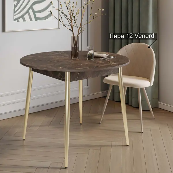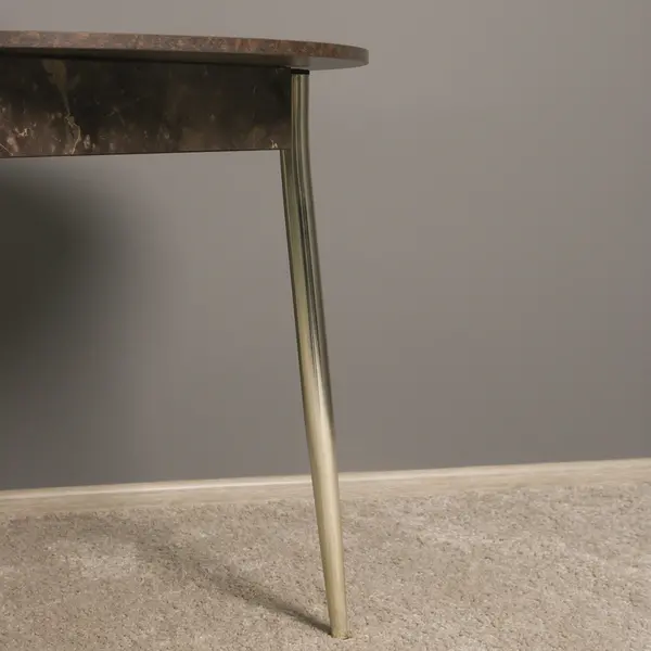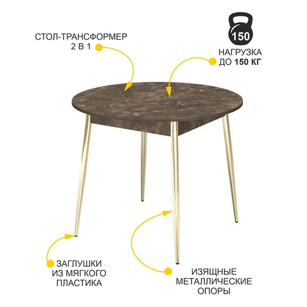Кухонный стол выполнен в благородном глубоком коричневом цвете. Мрамор Империал коричневый — это сложный, многослойный декор, который в сочетании с опорами благородного цвета «белое золото» формирует стильный и элегантный образ.