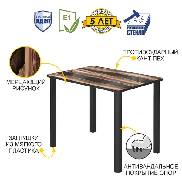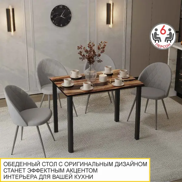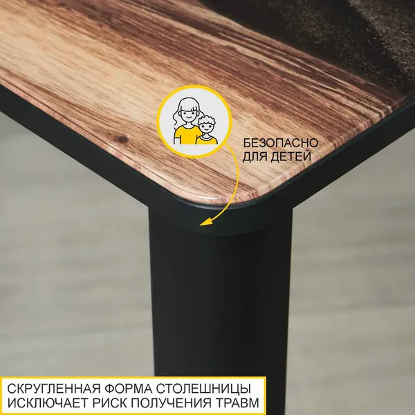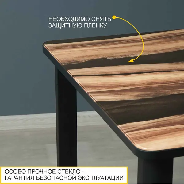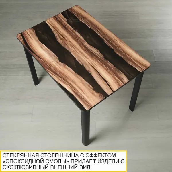 • Стеклянная столешница с древесным рисунком и эффектом эпоксидной смолы добавляет обеденному столу оригинальности и придает изделию эксклюзивный внешний вид. Благодаря стеклу рисунок не стирается и не выцветает со временем.