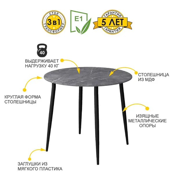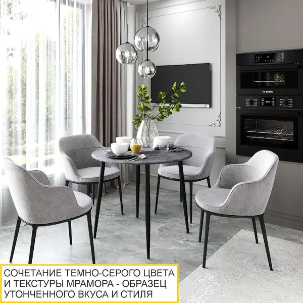 Темно-серый цвет, в котором выполнен стол, является базовым. Он прекрасно сочетается с различными оттенками и с успехом применяется в разнообразных стилях. Особое внимание привлекает текстура мрамора – это прекрасное решение для современного интерьера. Столешница имеет неповторимый многогранный рисунок.
