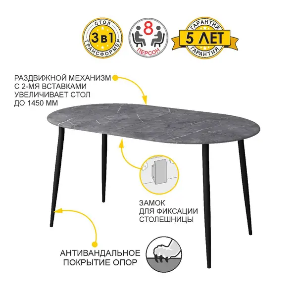 • Раздвижной механизм с 2-мя вставками увеличивает размер столешницы на 30 и на 60 см, что позволит удобно разместить как маленькую компанию, так и большую в любой праздник. За одну цену Вы фактически покупаете три обеденных стола: один – компактный для 4 персон (85х85 см) и два – с увеличенной столешницей на 6 (115х85 см) или 8 персон (145х85 см).