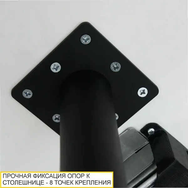 • Опоры выполнены из прочной стали толщиной 1,5 мм. Благодаря такому качеству материала опора выдерживает повышенную нагрузку на изгиб. Многие производители экономят и используют более тонкую сталь от 1 до 1,2 мм. Прочная фиксация опор к столешнице за счет 8 точек крепления.
