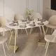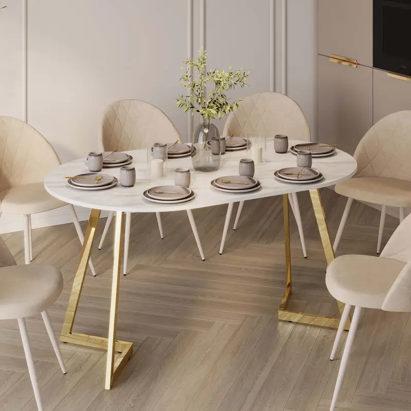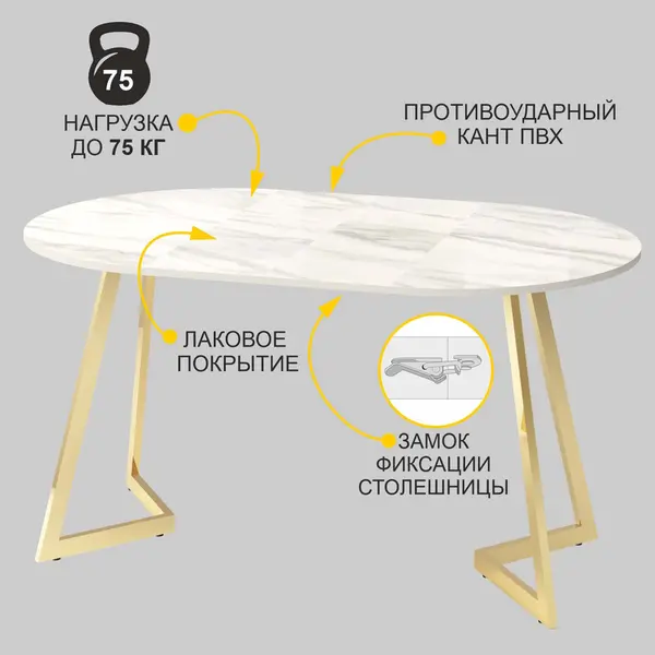 Столешница кухонного стола выполнена в универсальном декоре «Мрамор Империал Бежевый». Он сочетает в себе классические бежевые тона и изысканность мрамора. А в комбинации с золотыми опорами создает стильный и элегантный образ стола.