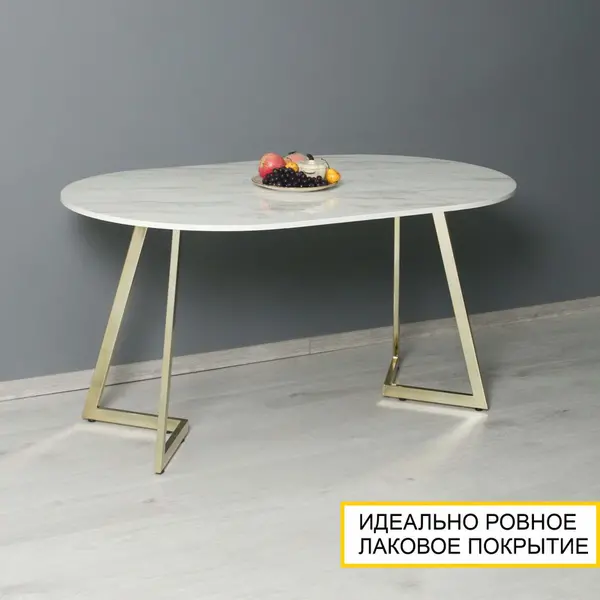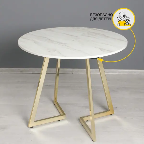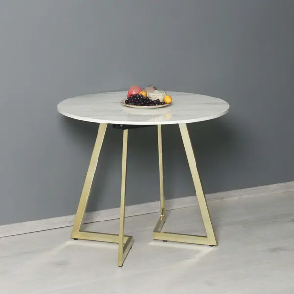 Круглая форма столешницы с декором "мрамор" – оригинальное решение, которое пользуется большой популярностью, визуально расширяет пространство и добавляет стильный акцент в интерьер. Глянцевые металлические опоры оригинальной формы — это стильное решение, которое станет изюминкой вашего интерьера. Они выполнены из высококачественной стали с глянцевым покрытием «золотого» цвета, что придает им роскошный вид.