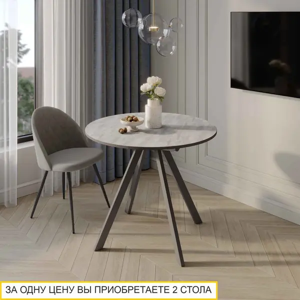 • За одну цену вы приобретаете 2 стола! В сложенном виде - это компактный круглый стол диаметром 90 см. Надежный механизм синхронного раздвижения и вставка-бабочка позволяют трансформировать столик во вместительный овальный стол с размером столешницы 120 см.