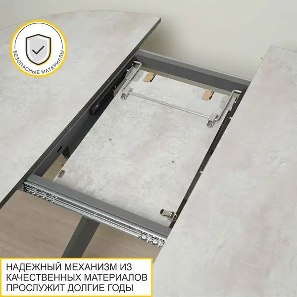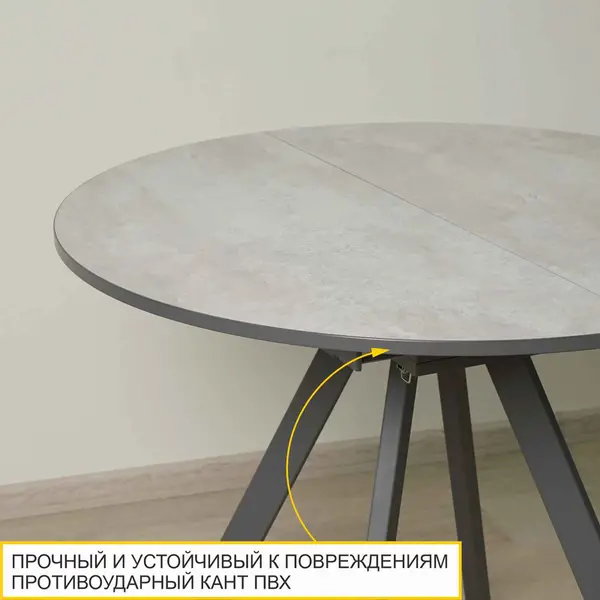 • Противоударный кант ПВХ толщиной 0,4 и 2 мм защищает края изделия от сколов и влаги, увеличивает срок эксплуатации стола обеденного раздвижного и сохраняет его внешний вид на долгие годы.