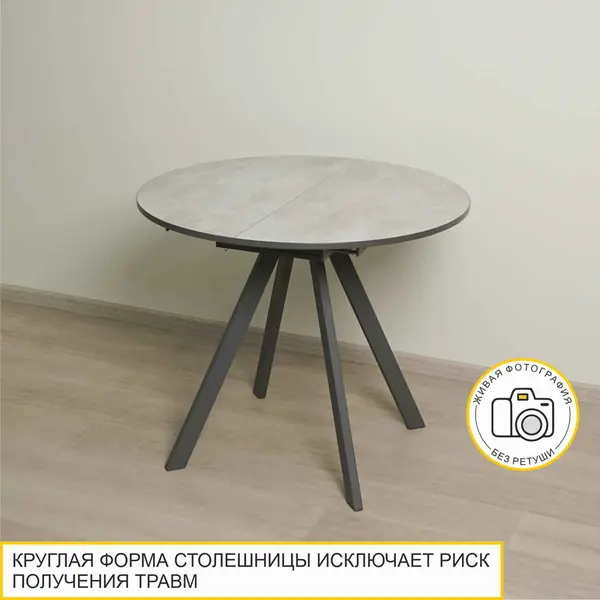• Популярная круглая форма столешницы исключает риск получения травм, безопасна для маленьких членов семьи. Вам не придется защищать углы специальными накладками для острых углов.