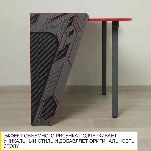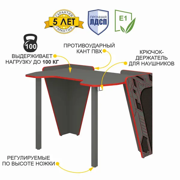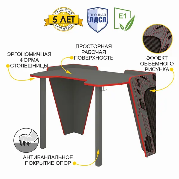 • Игровой компьютерный стол выполнен из материала ЛДСП 16 мм повышенной прочности, который устойчив к механическому истиранию и термическому воздействию. Выдерживает min 200 циклов истирания (по ГОСТу min 65).