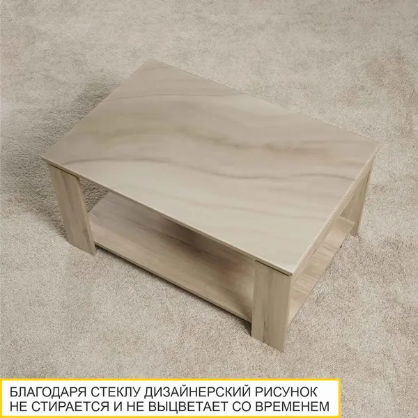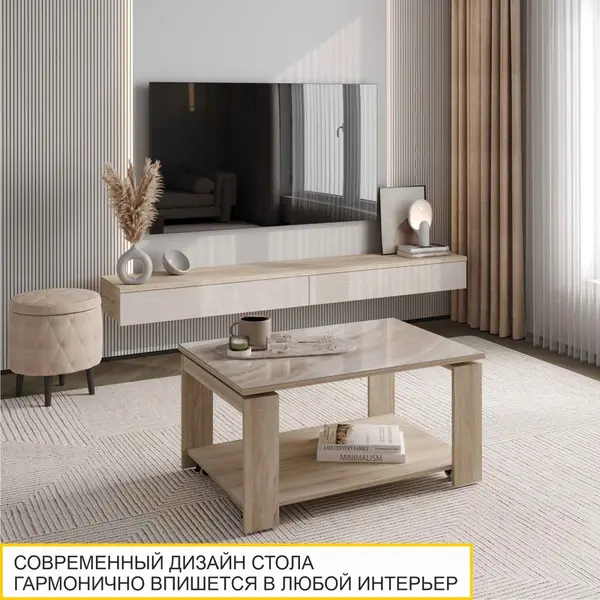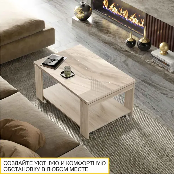 Журнальный столик выполнен в трендовом сочетании цвета «Дуб Кронберг» и кашемировых кремовых оттенков мрамора. Создает спокойную пастельную гамму, которая идеальна для комфортного и уютного интерьера.